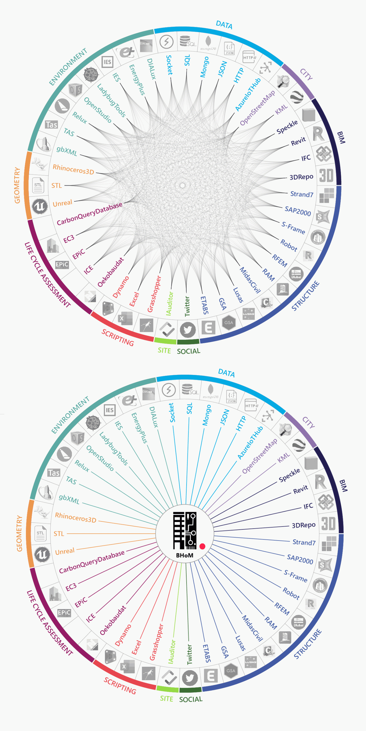 One-to-one connection approach between software packages (top) vs direct connection to BHoM centralised software-agnostic environment (above) highlighting current collection of main BHoM adapters