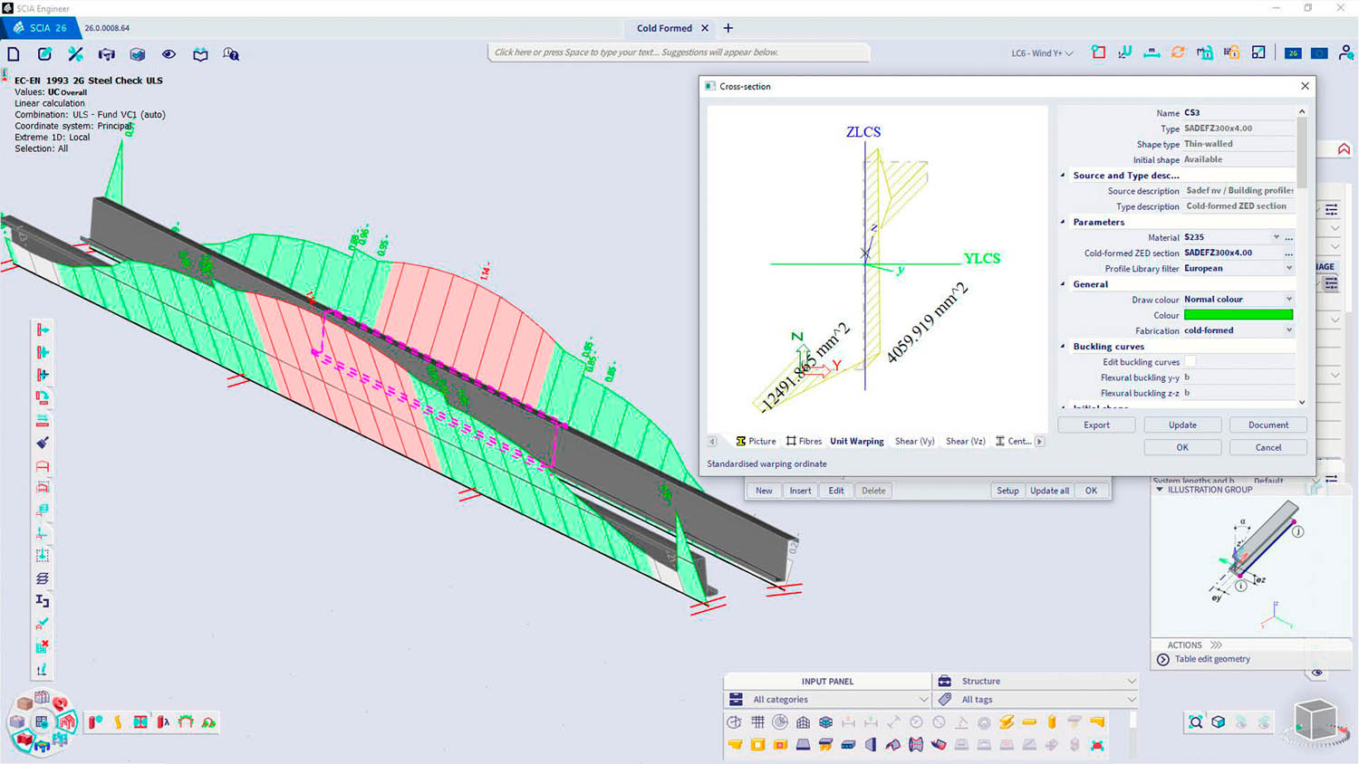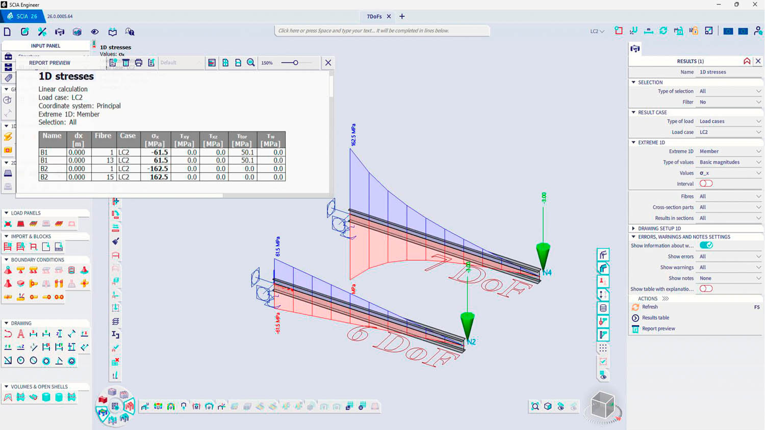 For elements subjected to high torsion or thin-walled/open-section beams, the “Beam FE accounting for warping (7th degree of freedom)” feature is said to ensure deeper, more accurate analysis, avoiding the limitations of standard beam finite elements.