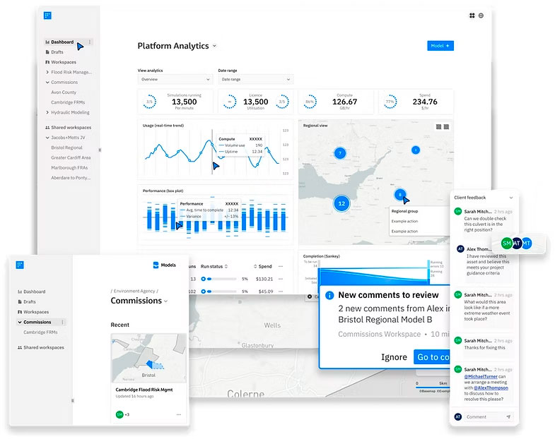It acts as a central location for data, simulations and collaboration, and integrates with flood modelling tools like Jacobs Flood Modeller.